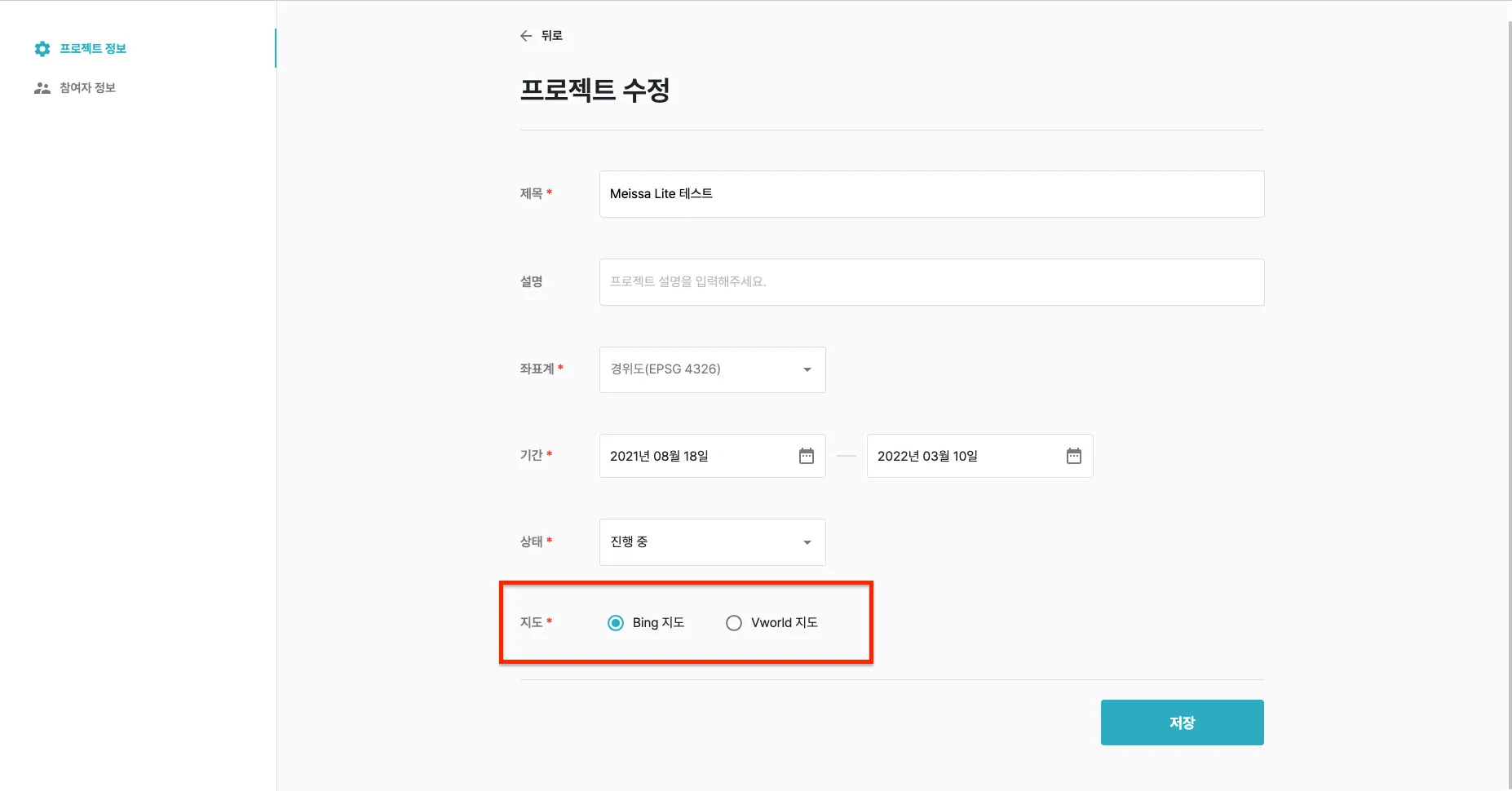 [프로젝트 - 설정 - 수정] 페이지에서 정사사진 뒤에 보여지는 위성지도를 직접 선택할 수 있습니다.