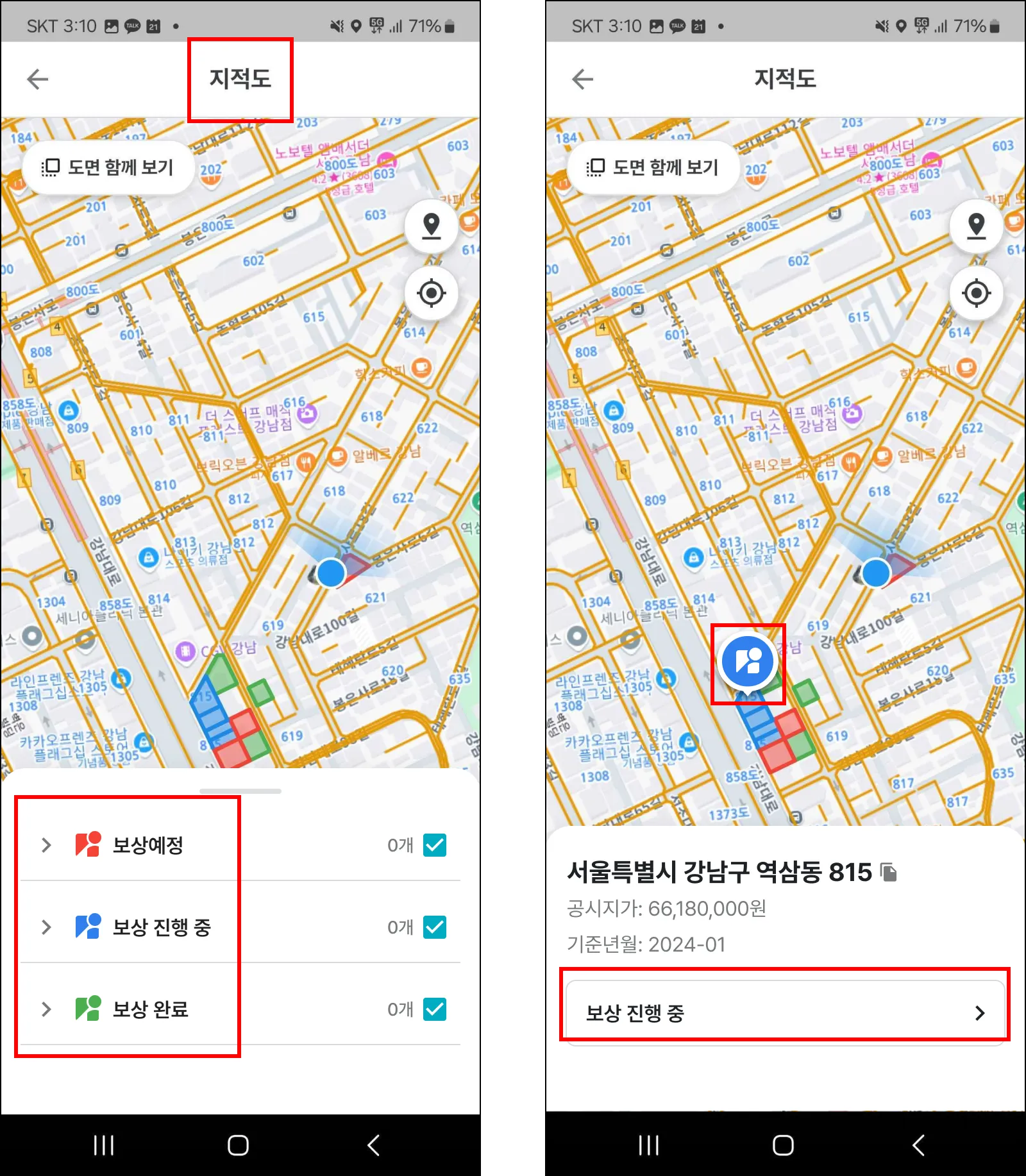 모바일 앱에서는 내 위치를 GPS 기반으로 확인하실 수 있기 때문에, 현장에서 위치 기반으로 지적도를 관리할 수 있습니다.