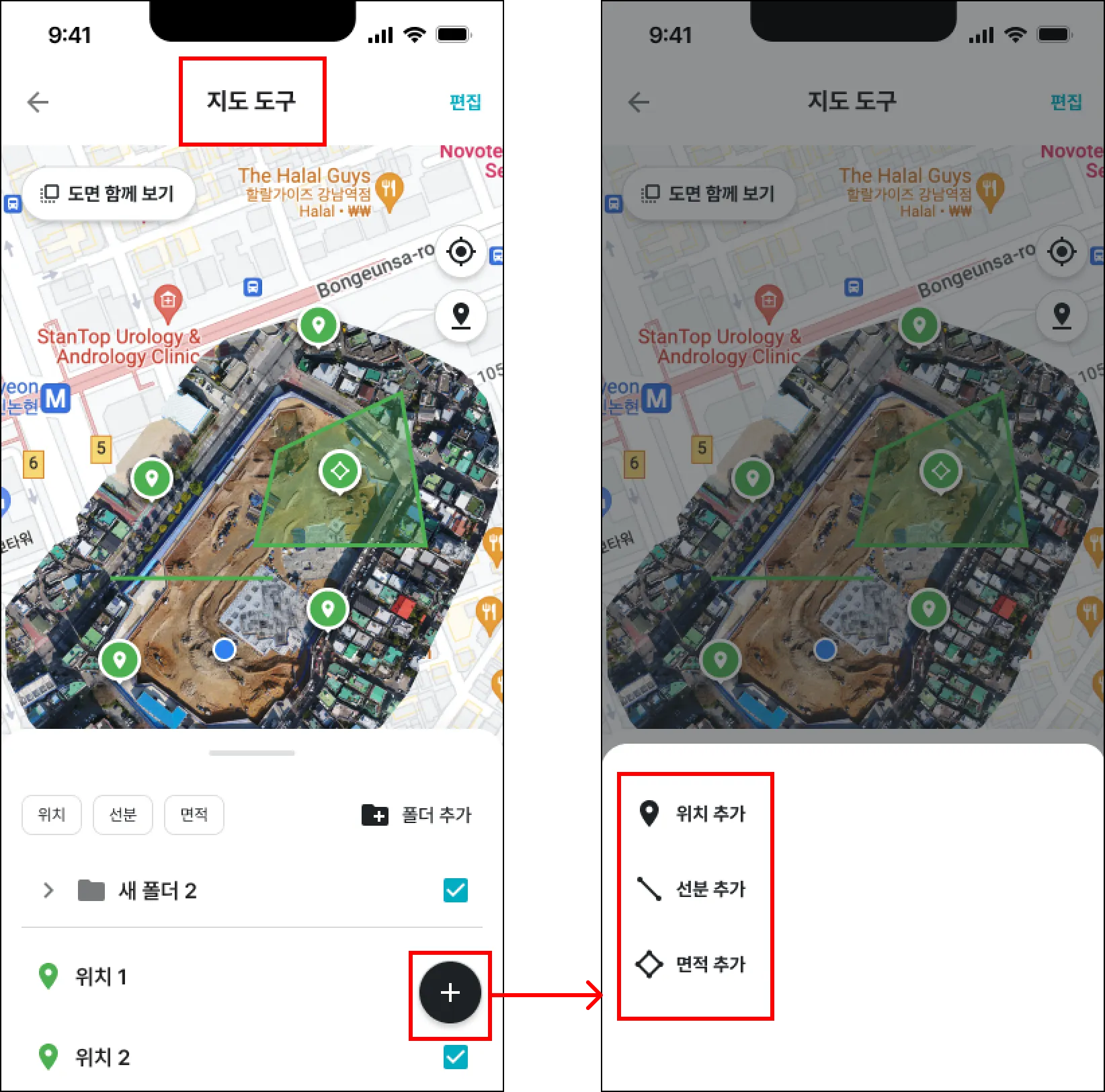 모바일 앱에서는 내 위치를 GPS 기반으로 확인하실 수 있기 때문에, 현장에서 위치 기반으로 지도도구를 생성하실 수 있습니다.