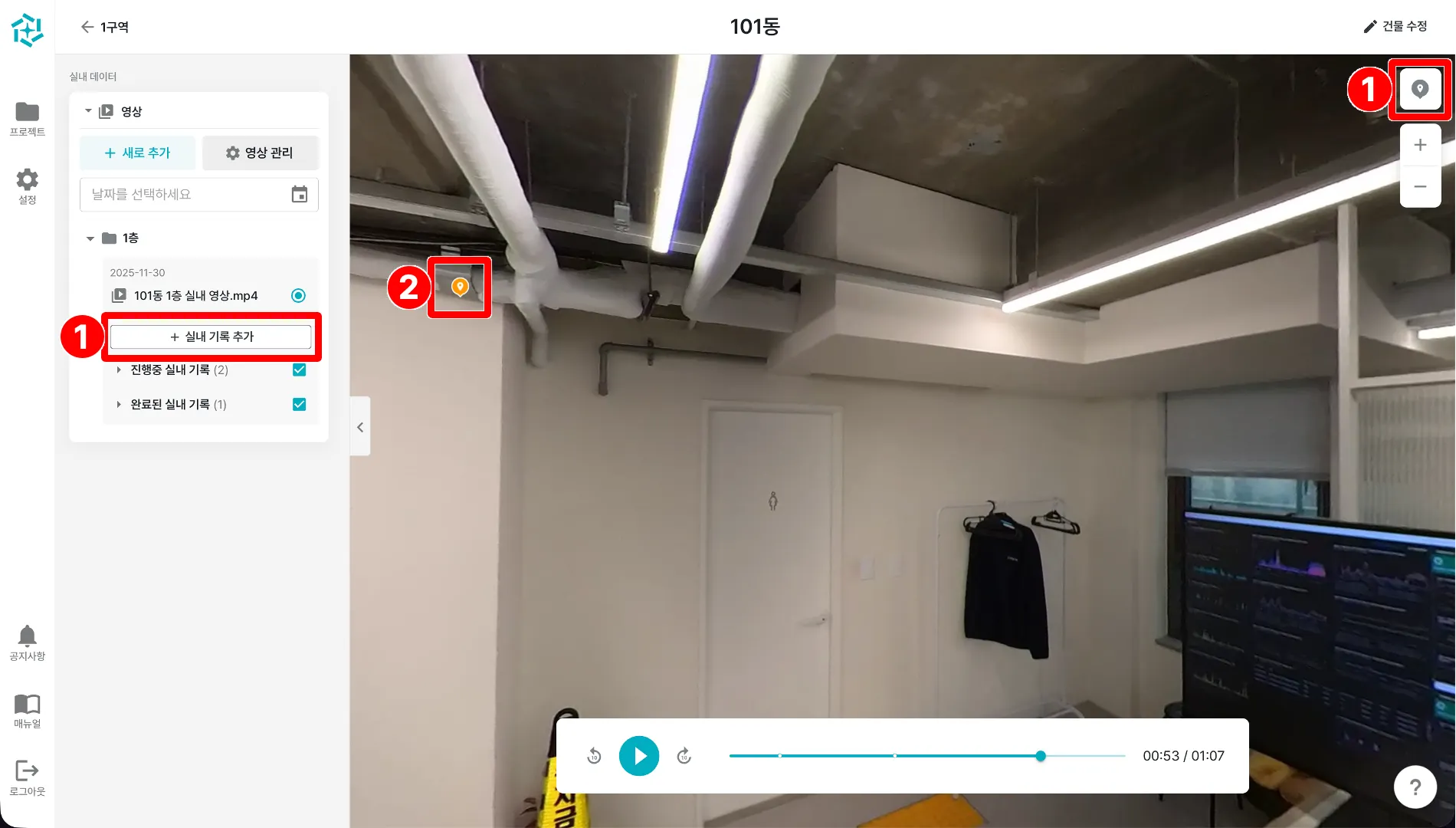 360도로 촬영한 실내 영상 위에 특정 시점·위치에 마커를 추가하여 하자, 점검 사항, 메모 등을 체계적으로 기록·관리할 수 있는 기능입니다.
