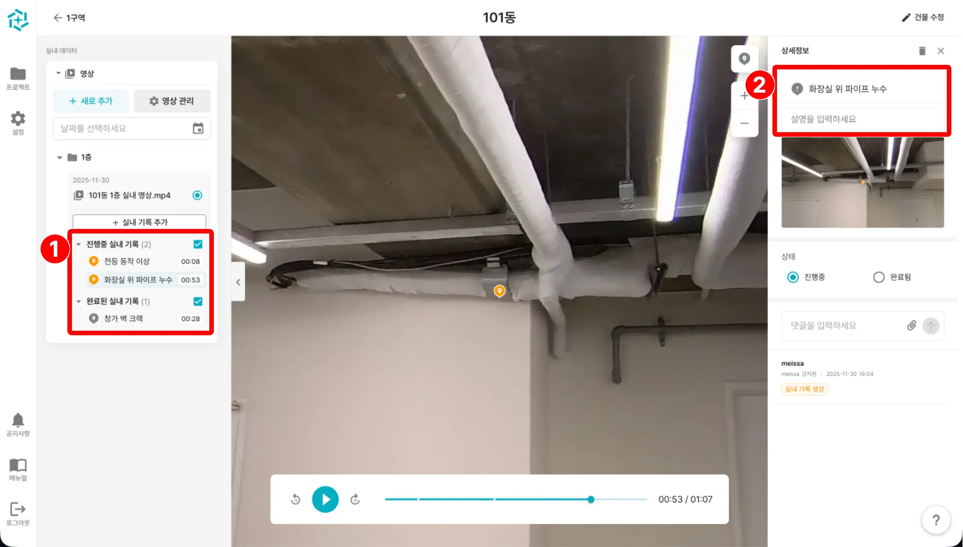 ① 실내 기록 상세 화면 오른쪽 하단 영역에서 댓글 입력을 할 수 있습니다. 댓글에는 사진 및 파일을 추가할 수 있습니다.