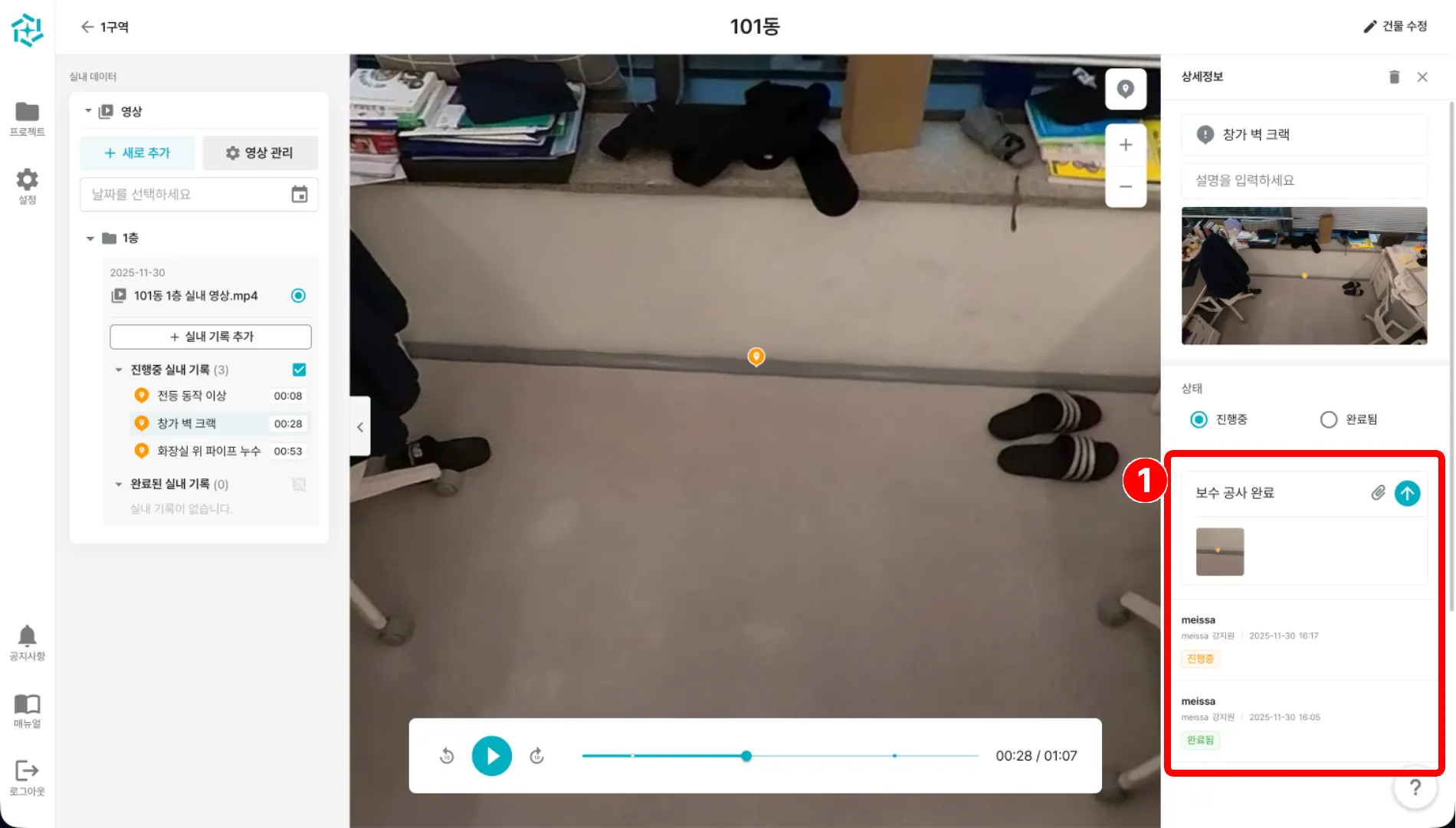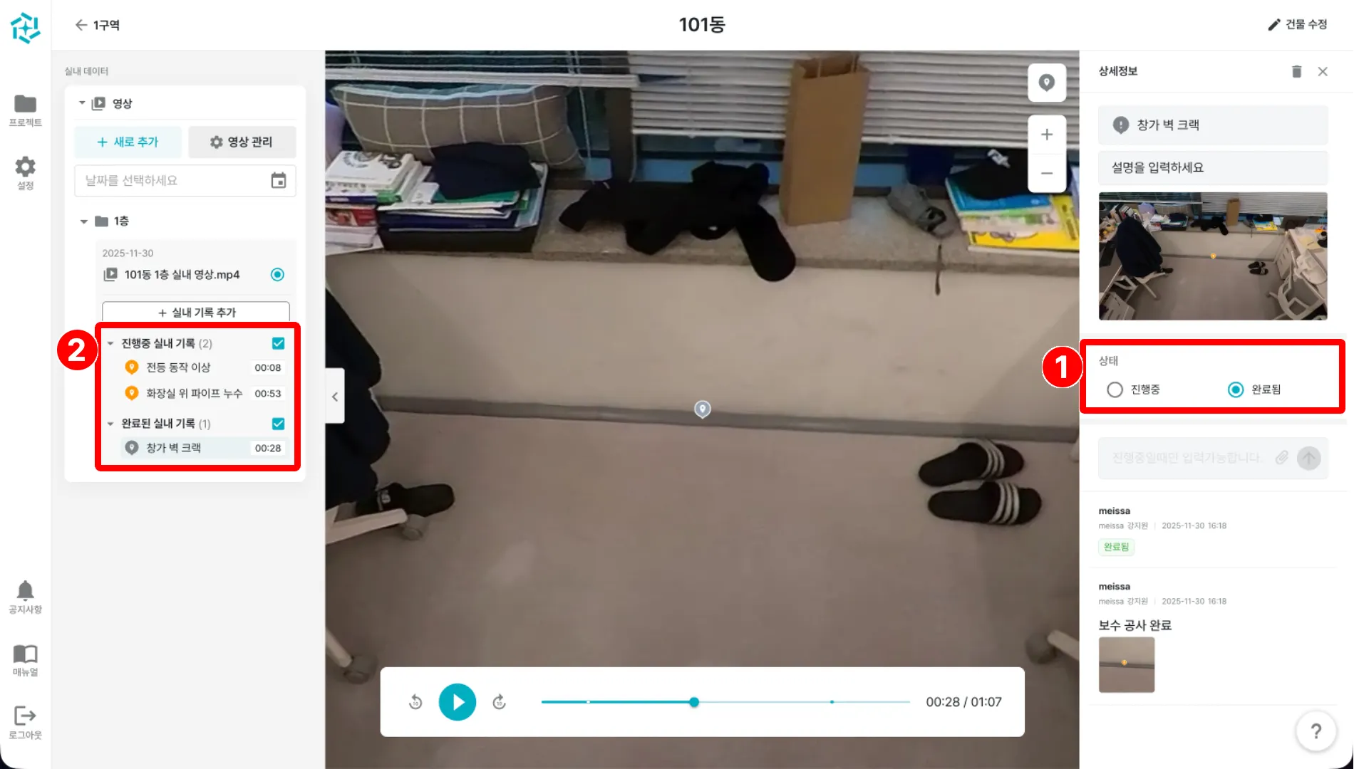 ① 실내 기록 상세 화면 오른쪽 중앙 영역에서 실내 기록의 상태를 변경할 수 있습니다. 이미 처리가 완료된 작업들은 완료 상태로 변경해보세요.