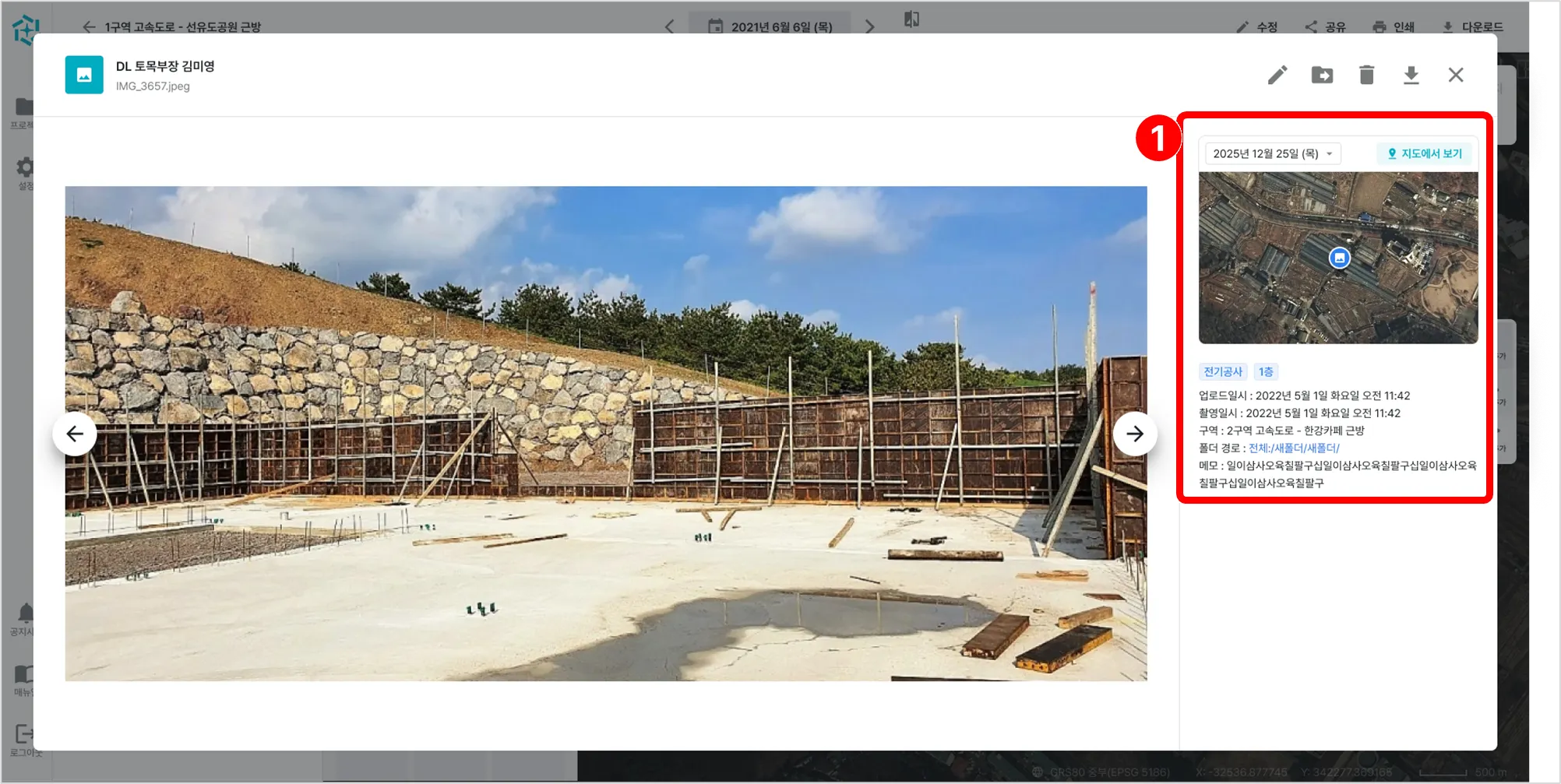 ① 업로드된 사진/영상/360 파노라마를 클릭하면, 우측 미니맵에서 촬영 위치를 확인할 수 있습니다.