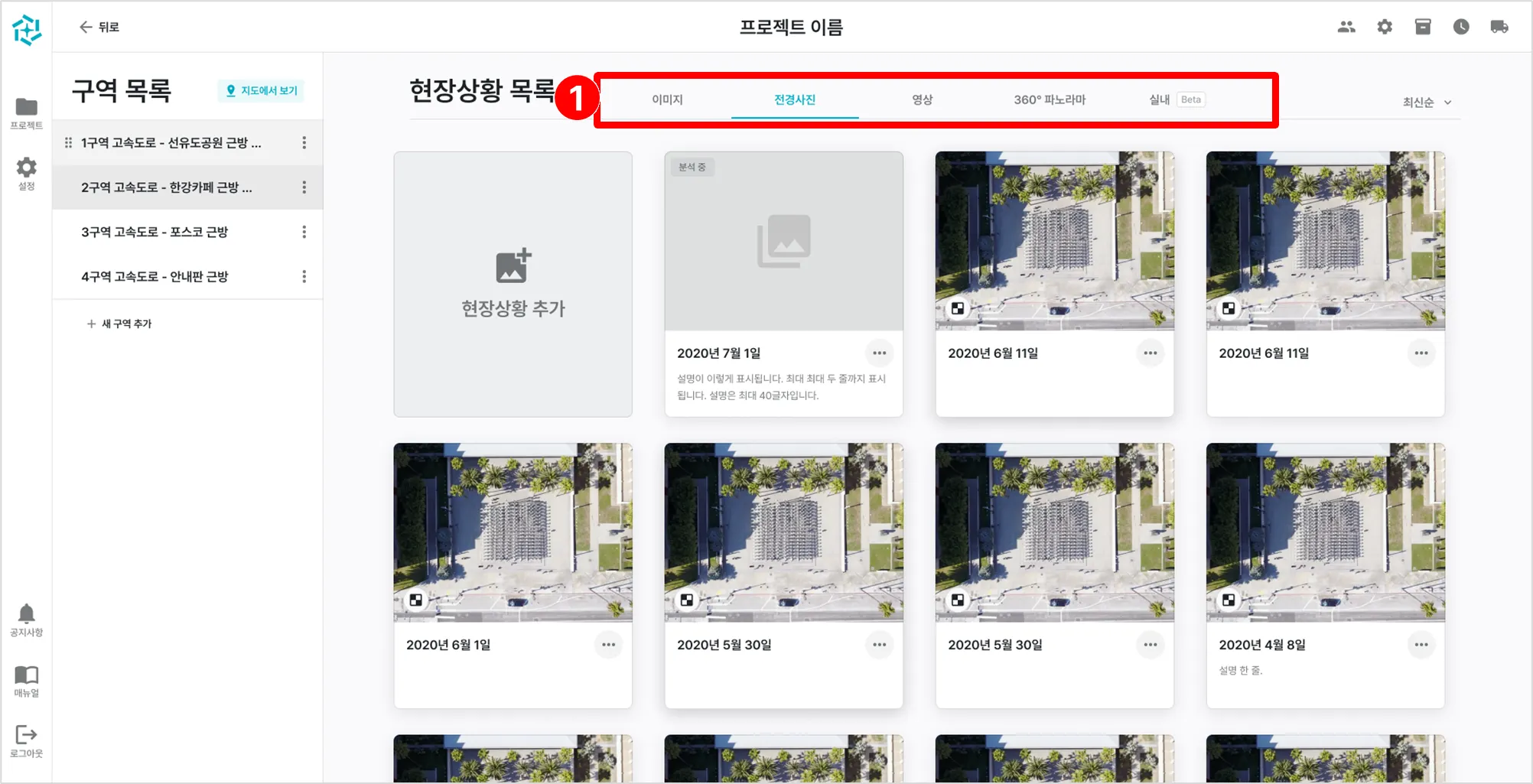 ① 기존에는 현장상황 목록에서 전경사진/영상/360 파노라마 파일을 업로드했습니다.