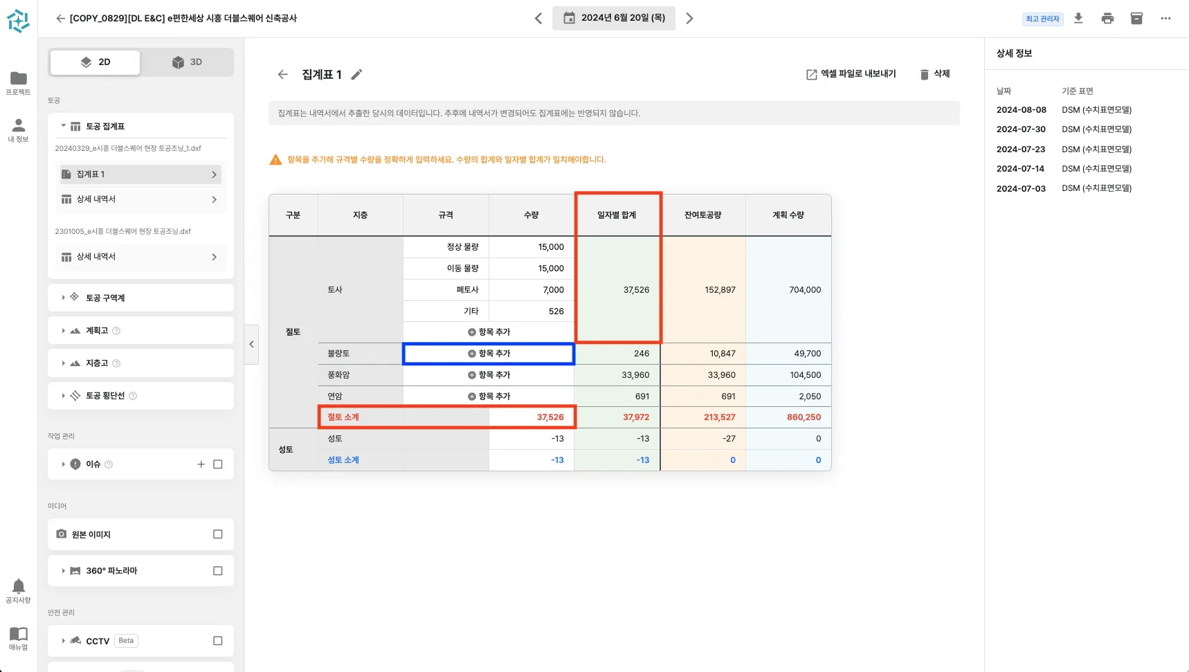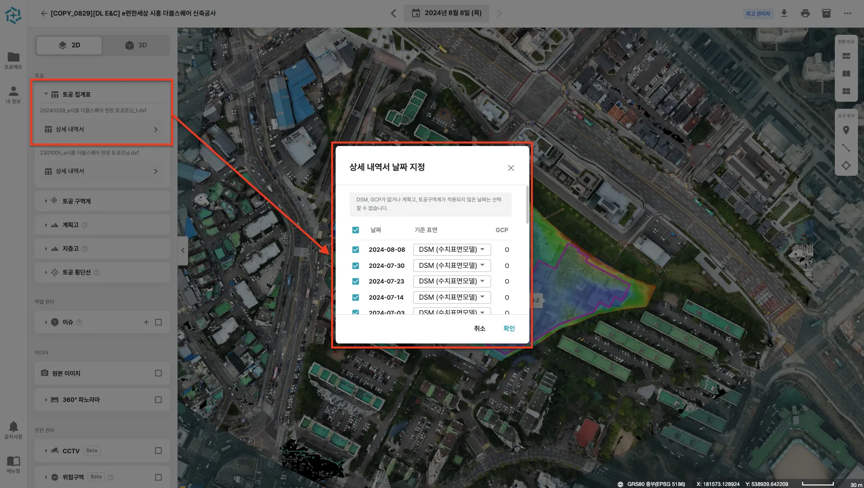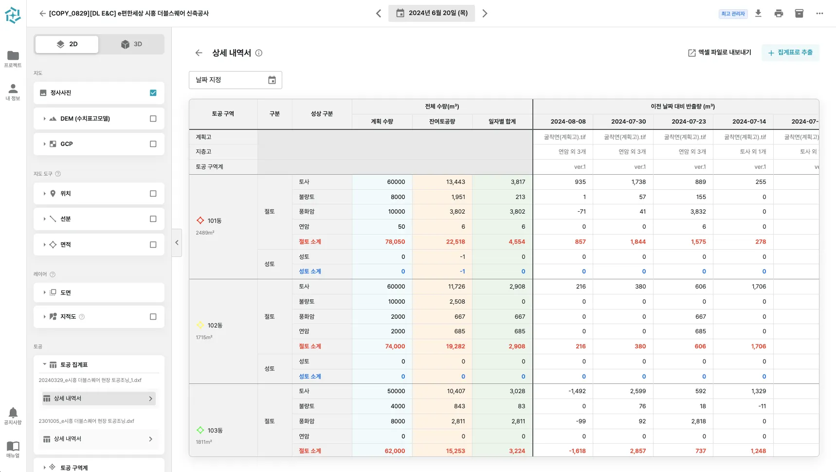 해당 기능을 통해 전체 토공 작업 현황을 일자 별로 한눈에 추적하고 관리 하실 수 있습니다.
