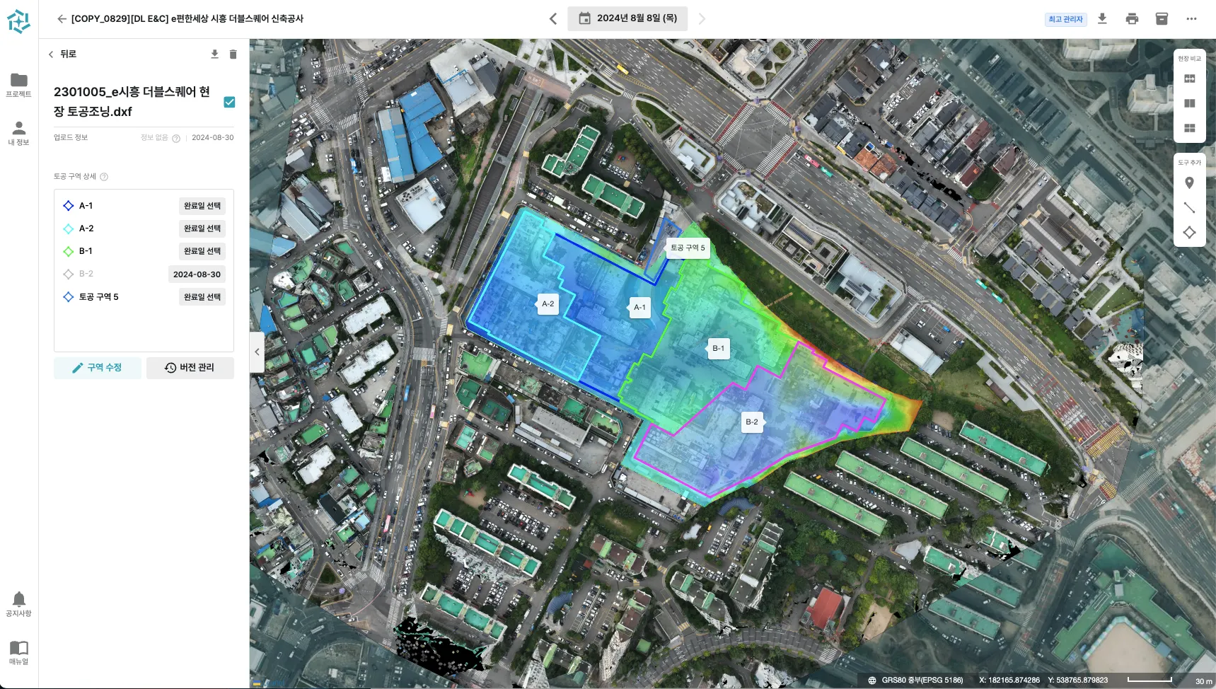 구역 별로 토공 작업 구간을 구분하여 작업량(이전 날짜 대비 작업량, 잔여 작업량)을 확인할 수 있는 기능입니다.