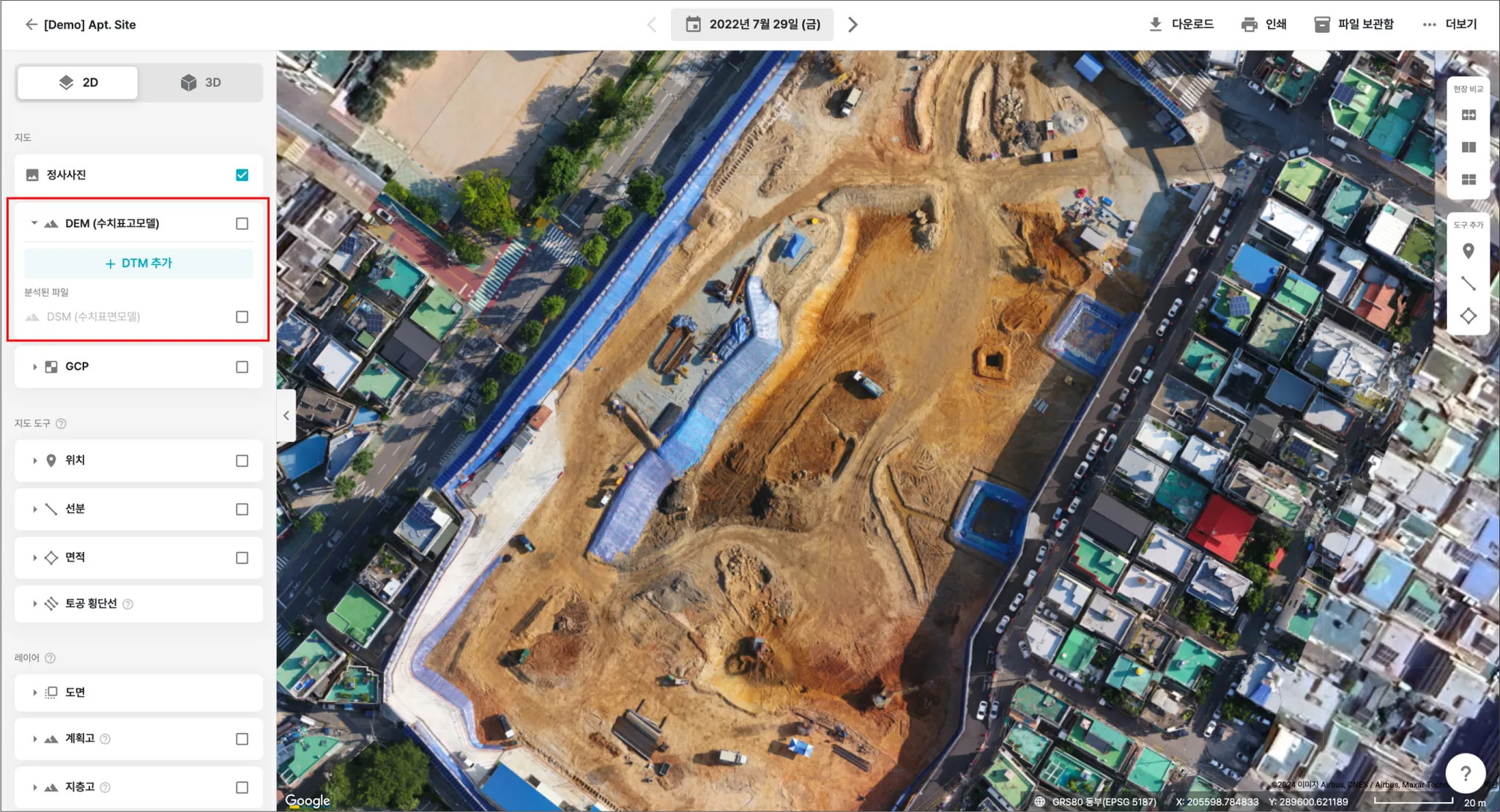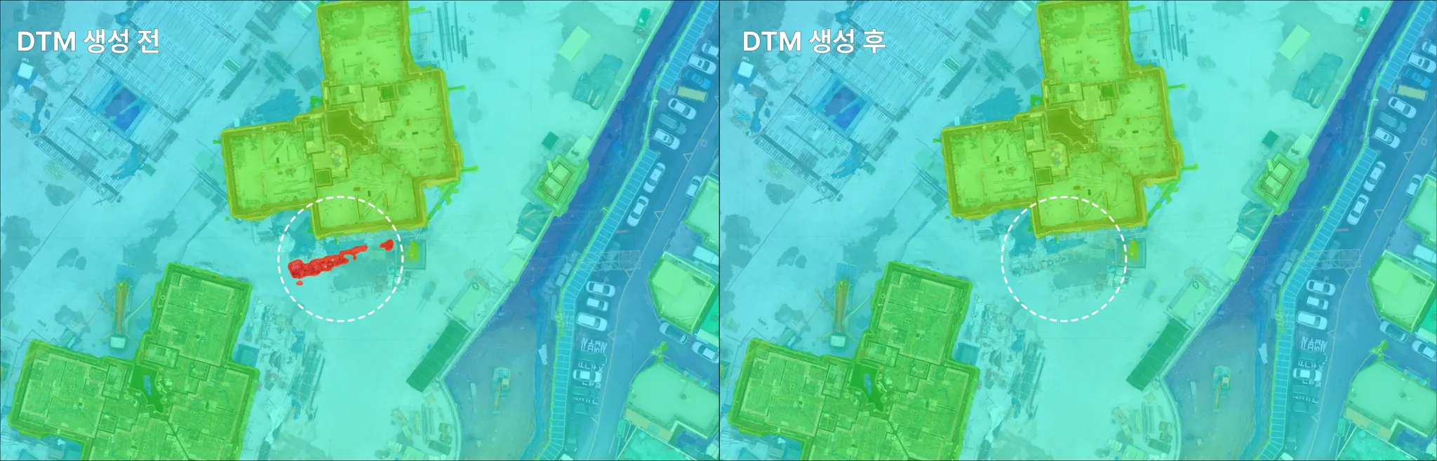 DTM 데이터를 생성하는 경우 공사 현장에서 토공 물량을 계산할 때, 계산에 불필요한 객체(토사, 중장비 등)를 제외하고 물량을 산출할 수 있습니다.