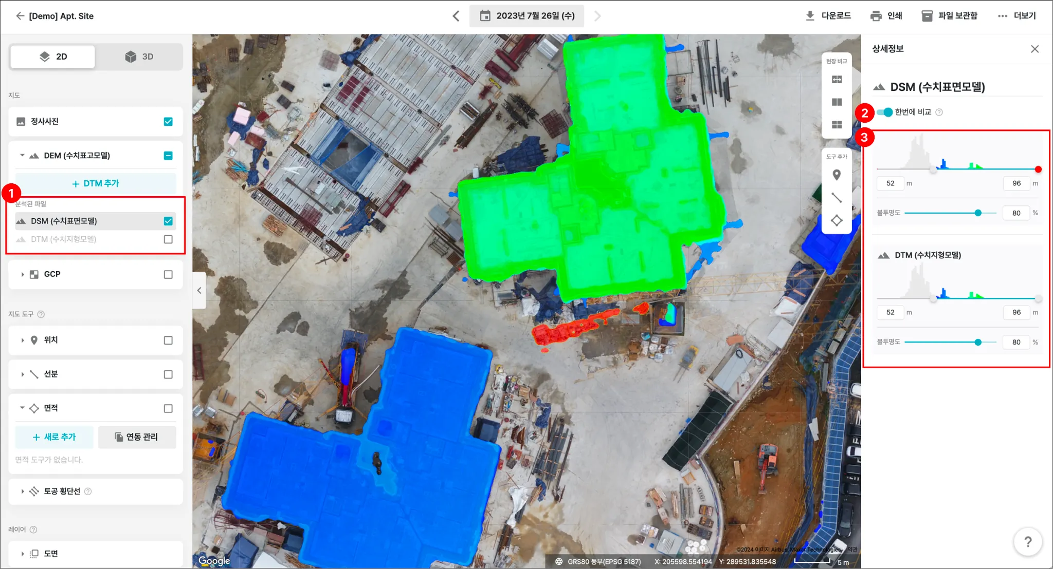 DTM 파일이 있는 경우 DSM과 비교하거나 업로드한 파일과 플랫폼 내에서 분석한 파일을 비교 할 수 있습니다