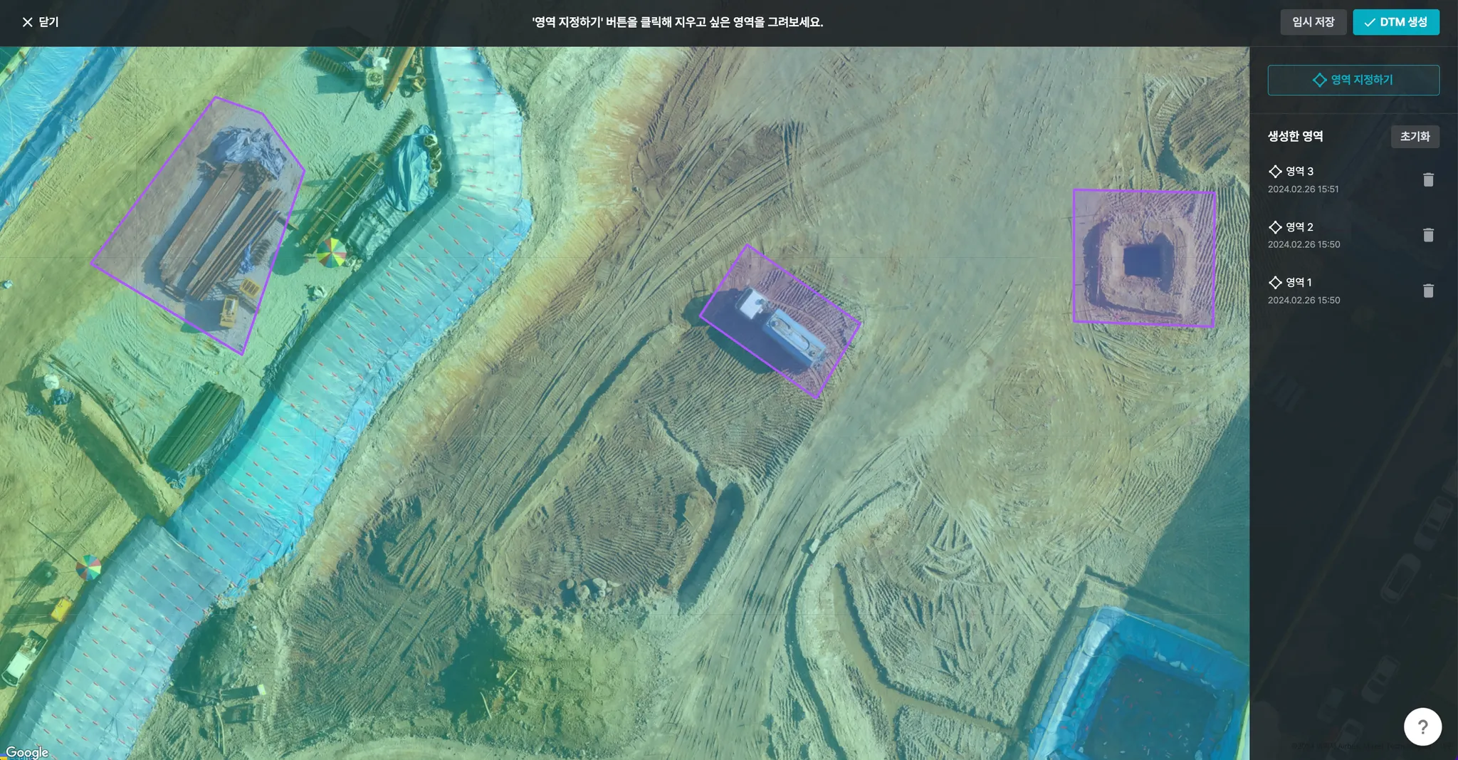 ❸ 지우고 싶은 영역을 모두 지정한 경우 DTM 생성 버튼을 클릭해 DTM을 생성할 수 있습니다.
