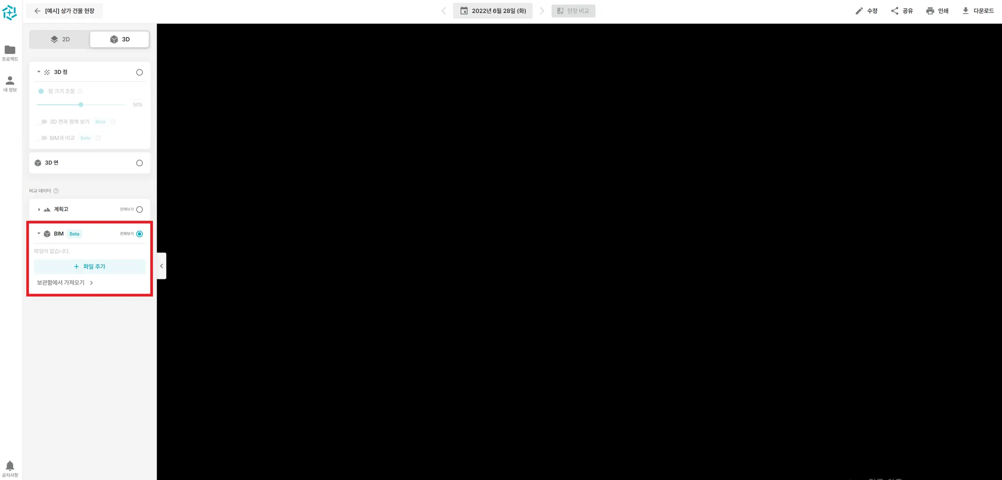 BIM : 현장 데이터를 3D형태로 제작한 설계 도면으로 ifc, rvt 확장자를 지원합니다.
