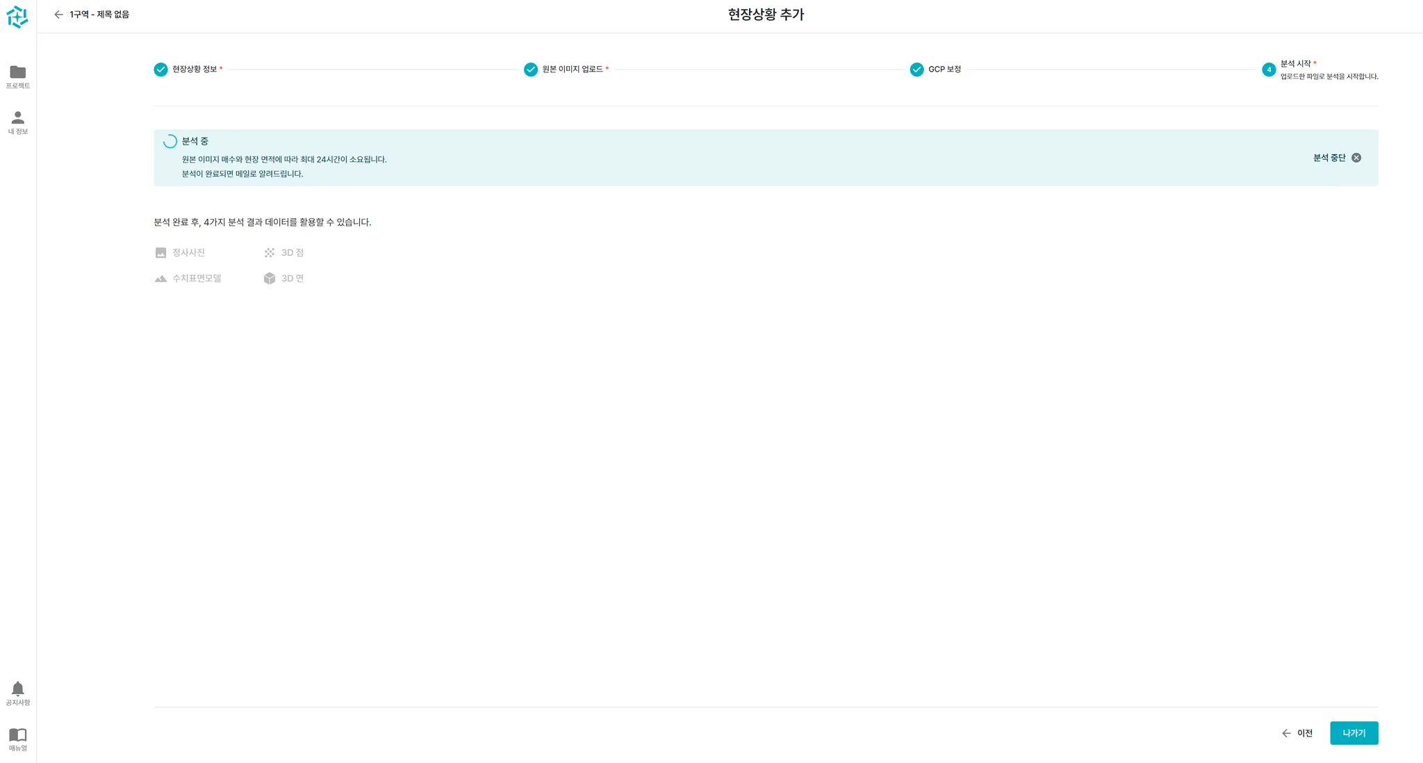 분석 소요 시간은 면적과 사진 장 수에 따라 달라지나 대략적인 시간은 아래와 같습니다.
