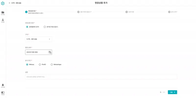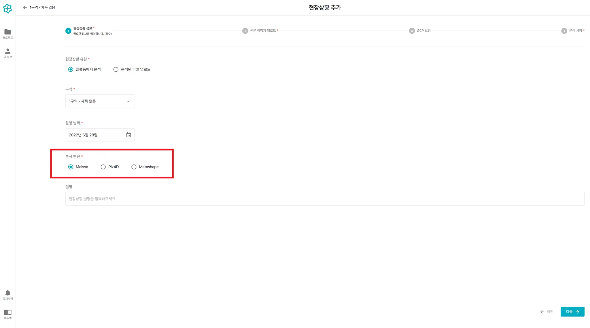 메이사 플랫폼은(Meissa, Pix4D, Metashape) 총 3개의 엔진 분석 방식을 제공합니다.