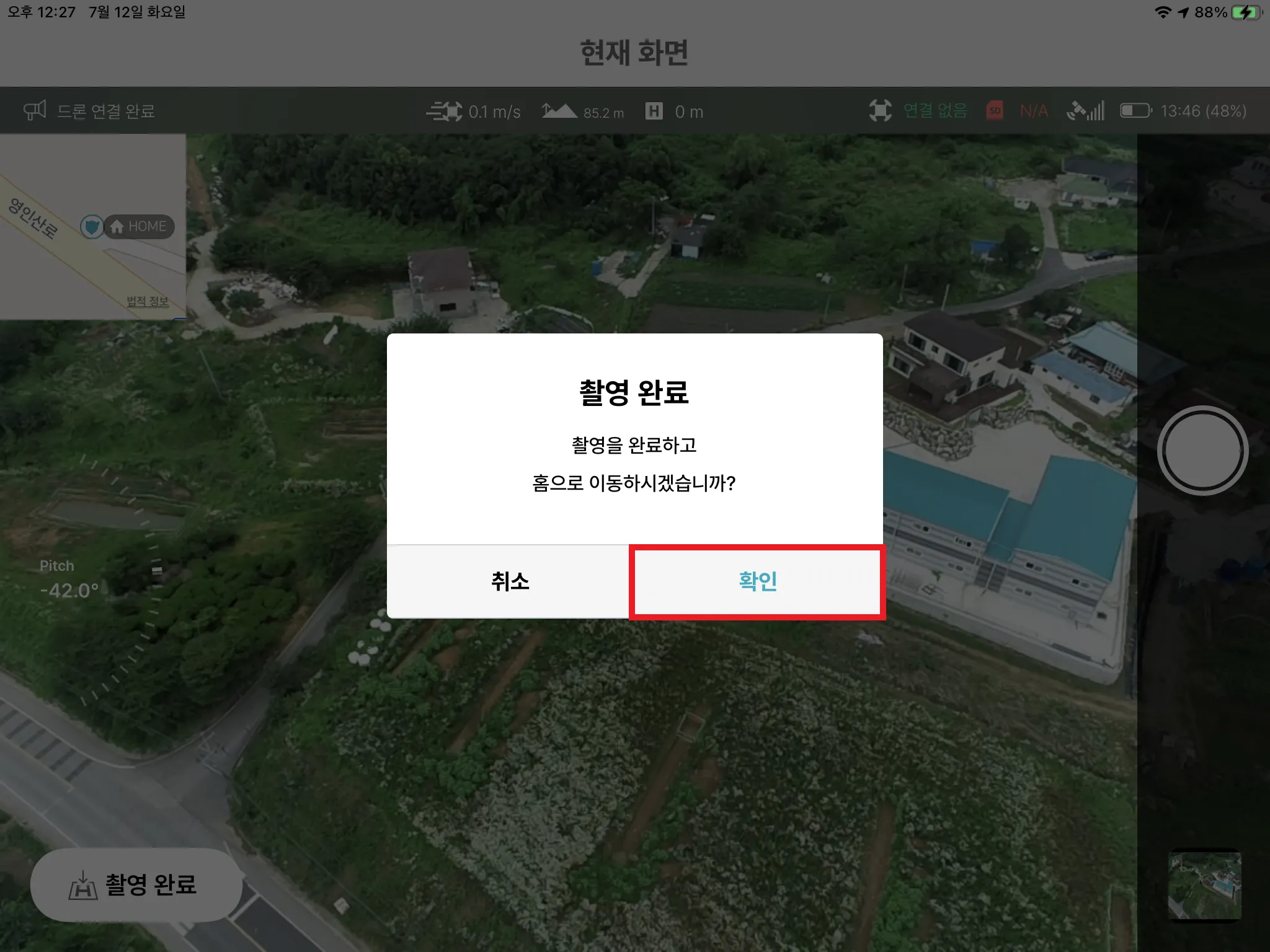 '드론 모양'이 초록색으로 '연결 완료'가 표시 되어야 합니다.