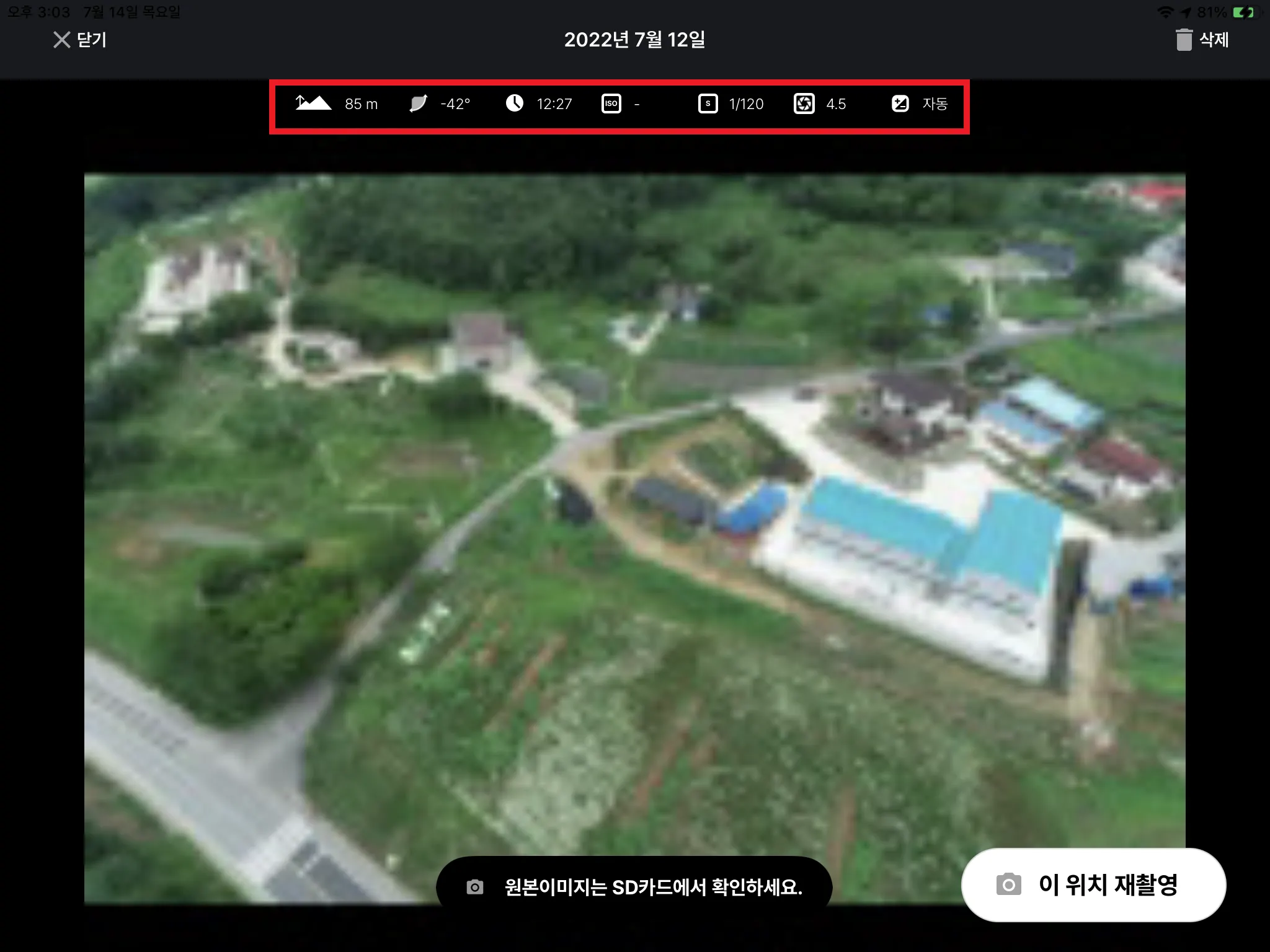 상단에서 해당 전경사진 촬영 조건 정보를 확인할 수 있습니다. (ex : 비행 높이, 촬영 각도, 비행 시간 등)