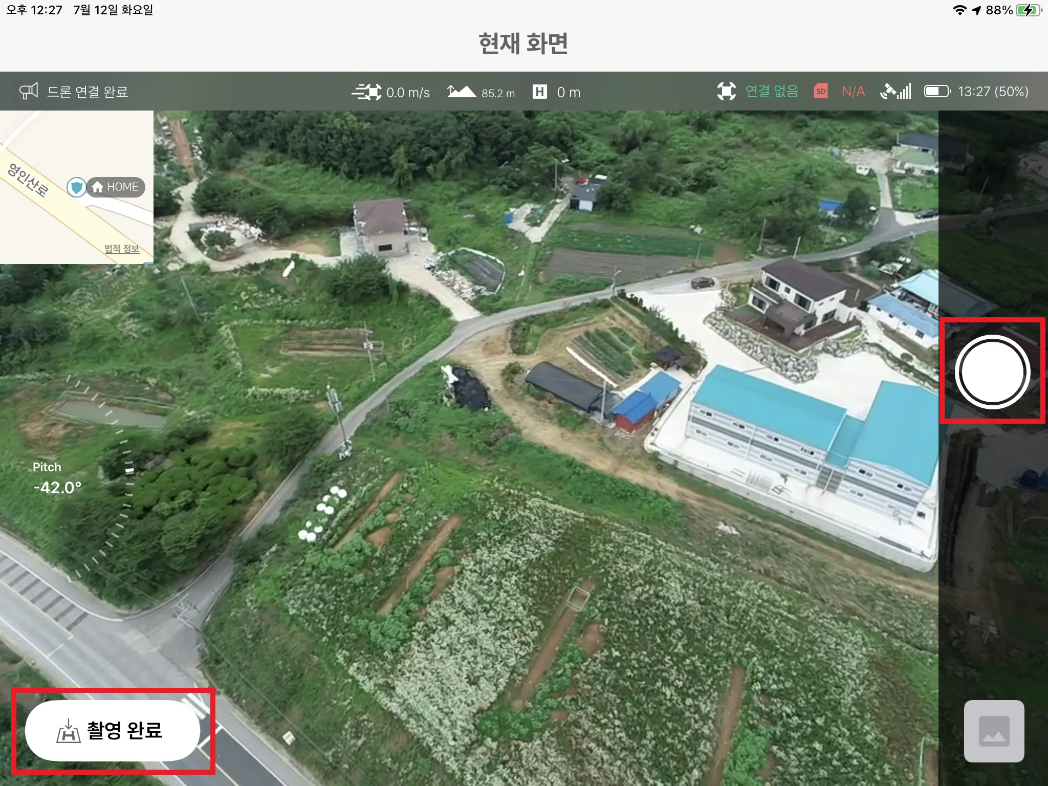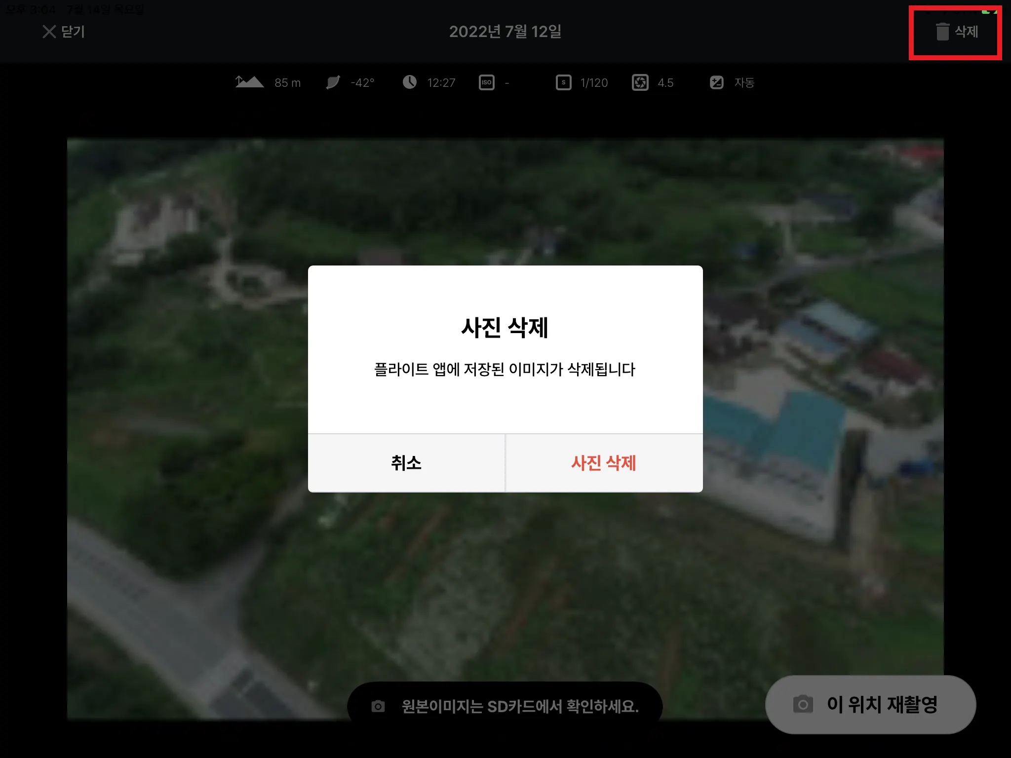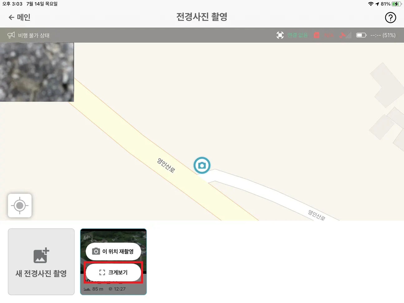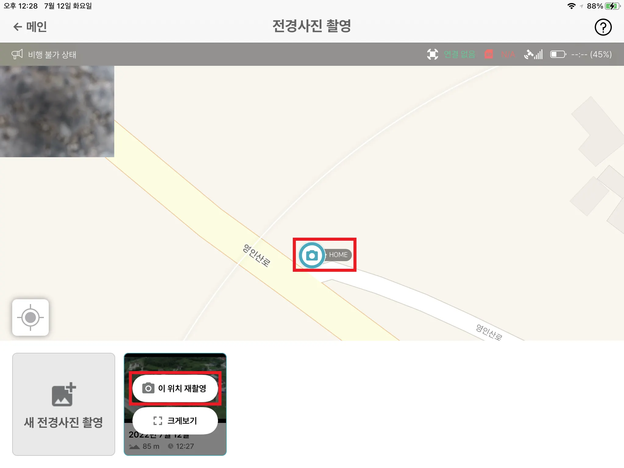 전경사진 재 촬영 시 드론이 바로 기동하기 때문에 주위를 잘 살피며 평평한 대지, 장애물이 없는 곳에서 날려야 합니다.