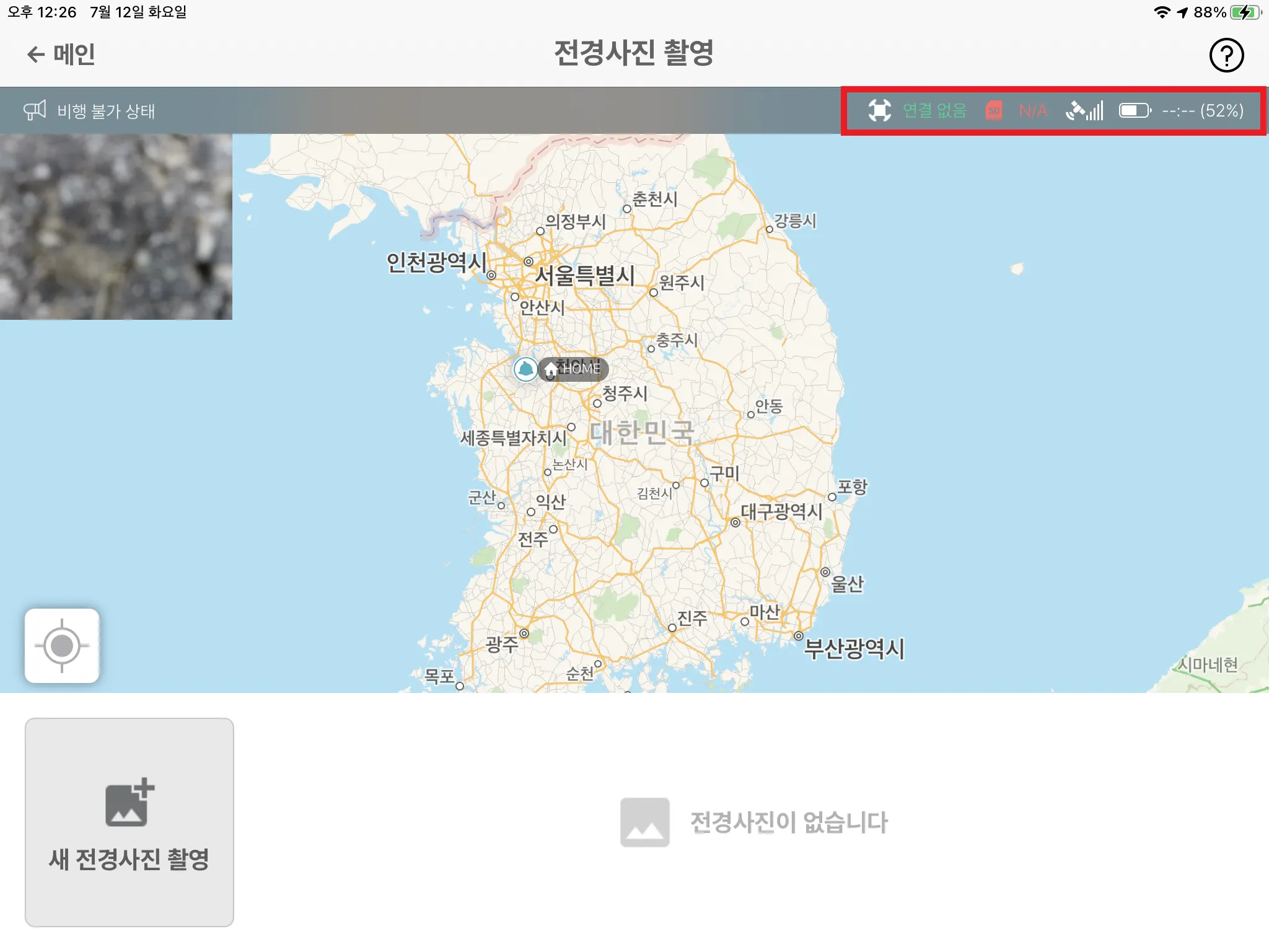 '전경사진 촬영'을 클릭하여 우측 상단에 표기되어 있는 항목으로 드론 기체 상태를 점검 합니다.