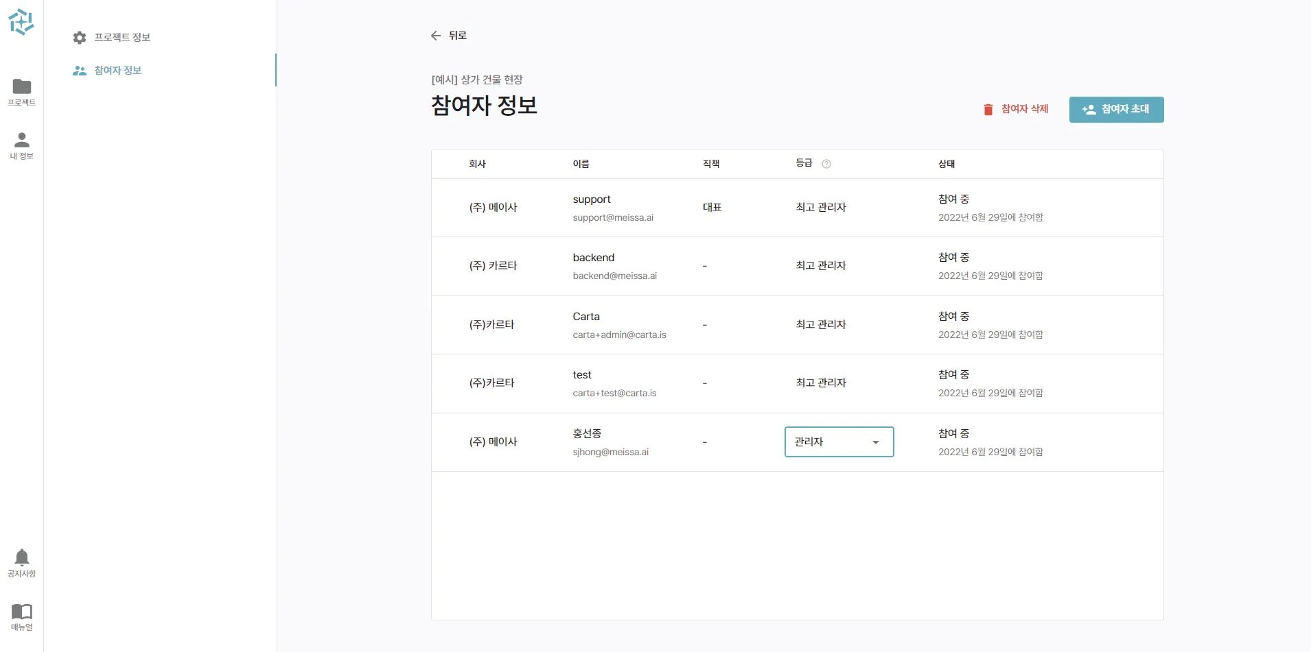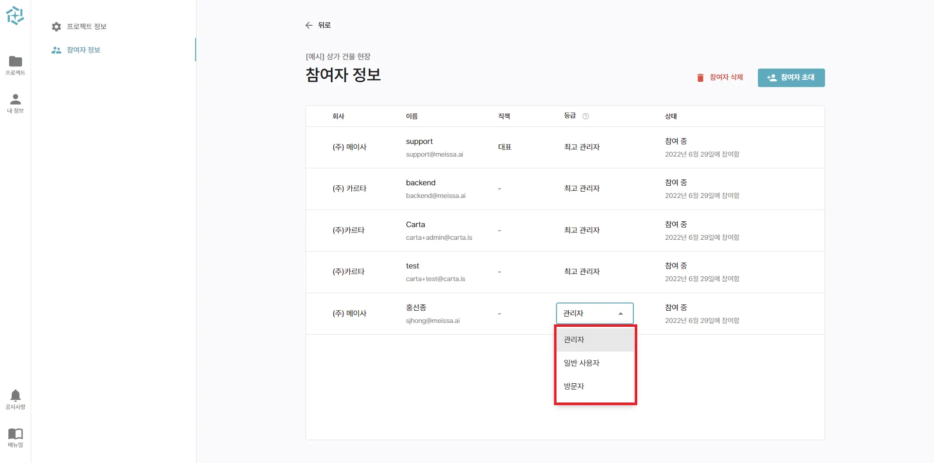 참여자 정보 탭으로 이동하여 프로젝트에 소속되어 있는 사람의 권한을 수정할 수 있습니다.
