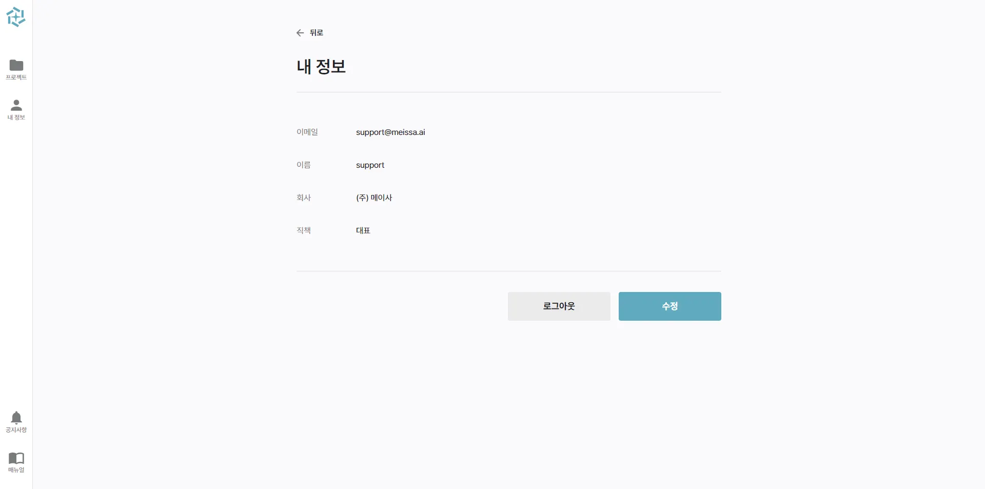 플랫폼 우측 상단의 '내 정보'를 클릭하시면 내 정보 페이지로 이동합니다. 보안을 위한 로그아웃, 기입된 상세 사용자 정보 수정이 가능합니다.